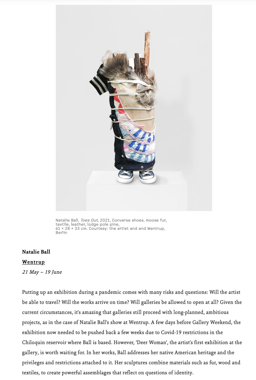 Putting up an exhibition during a pandemic comes with many risks and questions: Will the artist be able to travel? Will the works arrive on time? Will galleries be allowed to open at all? Given the current circumstances, it’s amazing that galleries still proceed with long-planned, ambitious projects, as in the case of Natalie Ball’s show at Wentrup. A few days before Gallery Weekend, the exhibition now needed to be pushed back a few weeks due to Covid-19 restrictions in the Chiloquin reservoir where Ball is based. However, ‘Deer Woman’, the artist’s first exhibition at the gallery, is worth waiting for. In her works, Ball addresses her native American heritage and the privileges and restrictions attached to it. Her sculptures combine materials such as fur, wood and textiles, to create powerful assemblages that reflect on questions of identity.