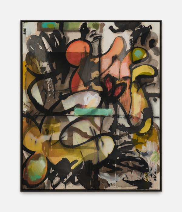Jan-Ole Schiemann's pictorial worlds are populated by motifs that move through the paintings like shadowy, humorous caricatures. His compositions are characterized by breaks, turning the graphic lines inside out and interlocking them in an organic structure. In the creation process, outlines, lines, and planes - like a vibrating rhythm - constantly write themselves in their automatic writing or drawing processes.
