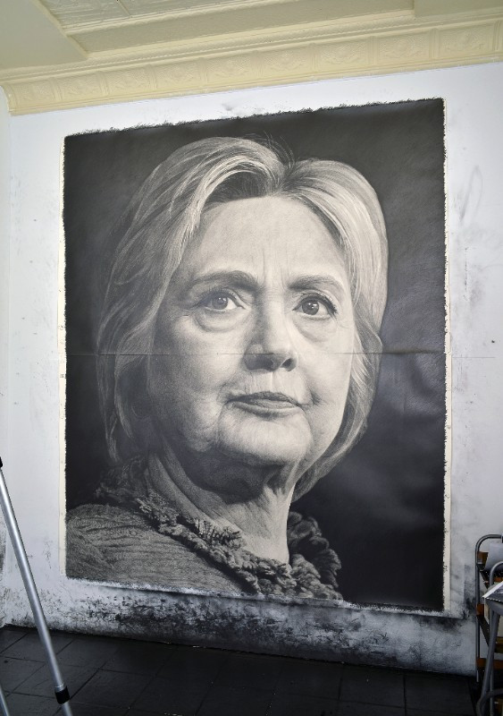 In this exhibition, Haendel uses the idea of the portrait to explore contemporary definitions of masculinity, power, and public identity. He undertakes the challenging task of drawing a portrait of what it is to be a man, or perhaps what is expected of men, in images that span a broad range of representations from the heroic to the abject, from the depiction of male achievement in the highest ranks of power to a raw and unsympathetic examination of a middle-aged convicted sex offender. An inquiry into what represents masculinity also requires a look at the conventions of gender representation, as masculinity and femininity have so long been defined, particularly in images, as a codependent set of complimentary traits. In BY AND BY Haendel both reasserts and undermines these conventions in heroic portraits of teenage girls riding rodeo, reproductions of murals depicting black civil rights leaders, and a monumental portrait of Hillary Clinton. His drawings and his video work against a tradition of portraiture that collapses individuals into ciphers and symbols that read as shorthand for historical legacies and narrative tropes.