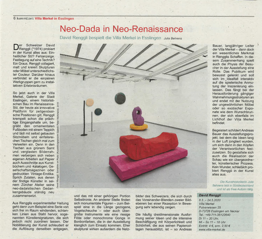 Julia Behrens: "Neo-Dada in Neo-Renaissance. David Renggli bespielt die Villa Merkel in Esslingen", kunst:art, März 2020.