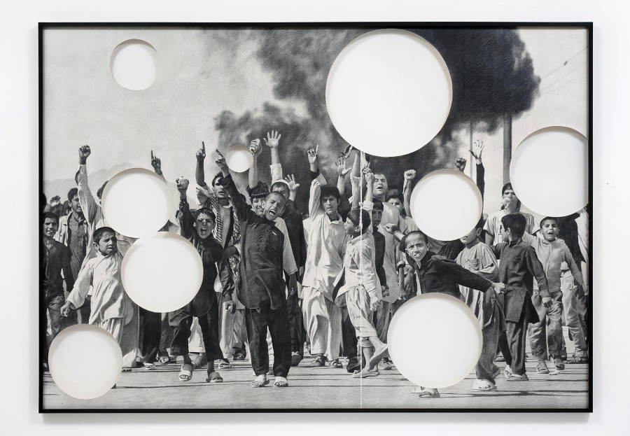 Karl Haendel's drawing Arabic Spring # 2, 2013 which will be on view in the show is based on an image from the newspapers and shows a group of protesting young arabic men. The artists want to drawn our attention to how we in the west are fed these same images over and over again of young angry arab boys and men, and this leads to certain anti-immigrant and anti-arab beliefs, and anti-immigrant policies of our western governments. The holes in the drawing interrupting the that narrative.