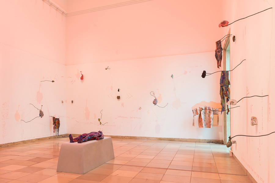 The show’s choreography is expansive and immersive, with prominent sound and video works intermingled with large-scale installations. The gold light of Mariechen Danz’s installation Womb Tomb (2015) saturates the first room, casting shadows of glass reproductive organs onto the walls. In the centre, a human figure lays flat, rendering the space a laboratory and pointing to the body as both an instrument and source of deeper knowledge and truth.