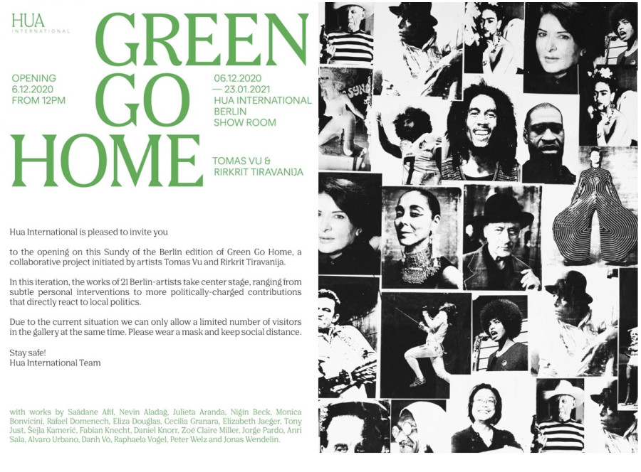 Potsdamer Str. 81b 10785 BerlinHua International is pleased to present the Berlin edition of Green Go Home, a collaborative project initiated by the internationally acclaimed artists Tomas Vu and Rirkrit Tiravanija. Green Go Home continually modifies its mediums, manifesting differently each time that it occupies a new landscape. Conceived as a form of dynamic dialogue with the looming protests and civil unrest throughout the world today, this context-responsive undertaking brings together found images and evocative text that equally recall the fragmented language of self-actualization found on many social media platforms and the poetic, agit-prop of historical movements like the Situationist International. In the imagery itself, revolutionaries like Angela Davis rub shoulders with pop cultural figures such as David Bowie, Tupac Shakur, and Barbarella, or artists Frida Kahlo and Ana Mendieta, and scenes from films or a found photo of a historic beauty pageant. The grid of images takes on a polyphonic relationship to Tiravanija’s written statement, thereby interweaving layers of interpretation, readings, and misunderstandings.
