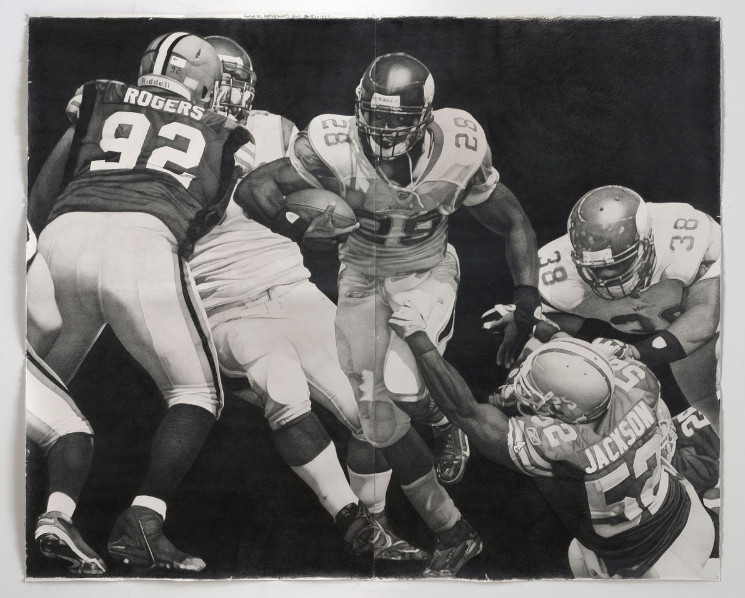 If so, Philbrook Downtown is opening Friday a new exhibit built around its most recent acquisition: an gigantic graphite drawing of Minnesota Viking running back and former Oklahoma Sooner Adrian Peterson breaking through the Cleveland Browns’ defensive line during the first game of the 2009 NFL season.