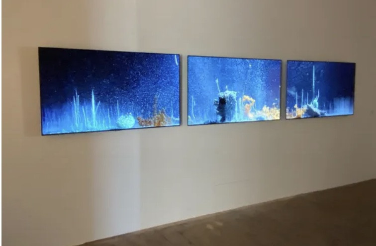 Strongly influenced by his background as both an artist and a scientist, Hicham Berrada’s work combines intuition and knowledge, science and poetry. He explores scientific protocols that closely imitate various natural processes and/or weather conditions. A veritable operating theatre, Présage is the result of a performance in which the artist combined various chemical products in a beaker. These manipulations produce a chimerical landscape in constant metamorphosis. The Présage performance series reveals landscapes emerging inside a jar. By gradually adding different elements – such as iron, copper, and tin – to a jar containing acidic or alkaline mixtures, a spectacle of unknown forms unfolds. These transformations of matter, simultaneously filmed and projected on screen, immerse the audience in a world of fascinating colors and shapes. In this way, Berrada avoids any kind of postproduction work on his videos, which for him are as much documentation as autonomous works of art.