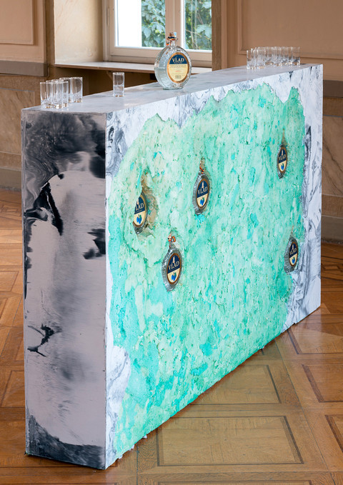 The artist duo Katharina Stöver and Barbara Wolff have been working together since 2005 under the name of Peles Empire, questioning categories like “original” and “reproduction” in their work. They borrow not just the name of the Romanian castle of Peles, but alienate it as part of their work. The historical structure, which unites different historic architectural styles in a collage-like manner, is always a reference point for the works, which often undergo a double translation of two- and threedimensionality, from object to image of it and back to sculpture. In addition, the aspect of hosting is part of the artistic practice of Peles Empire, who have created various spaces for dialogue and organized exhibitions with other artists in Frankfurt, London, Los Angeles, Cluj, Istanbul and Berlin. For Portikus XXX, Peles Empire return to Frankfurt where they started with salons and bar evenings. They are presenting a bar made of Jesmonite, a special material that the two artists have discovered for their work and reconceived as a form of expression.
