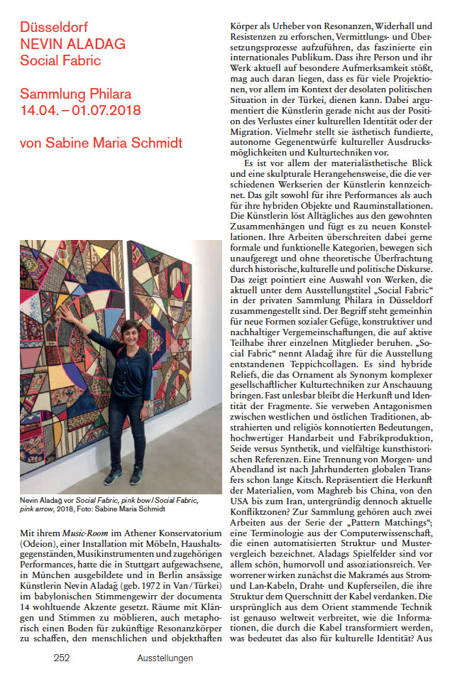 Sabine Maria Schmidt: Nevin Aladag – Social Fabric, Kunstforum International, Band 254, June/July 2018, p. 252–254.